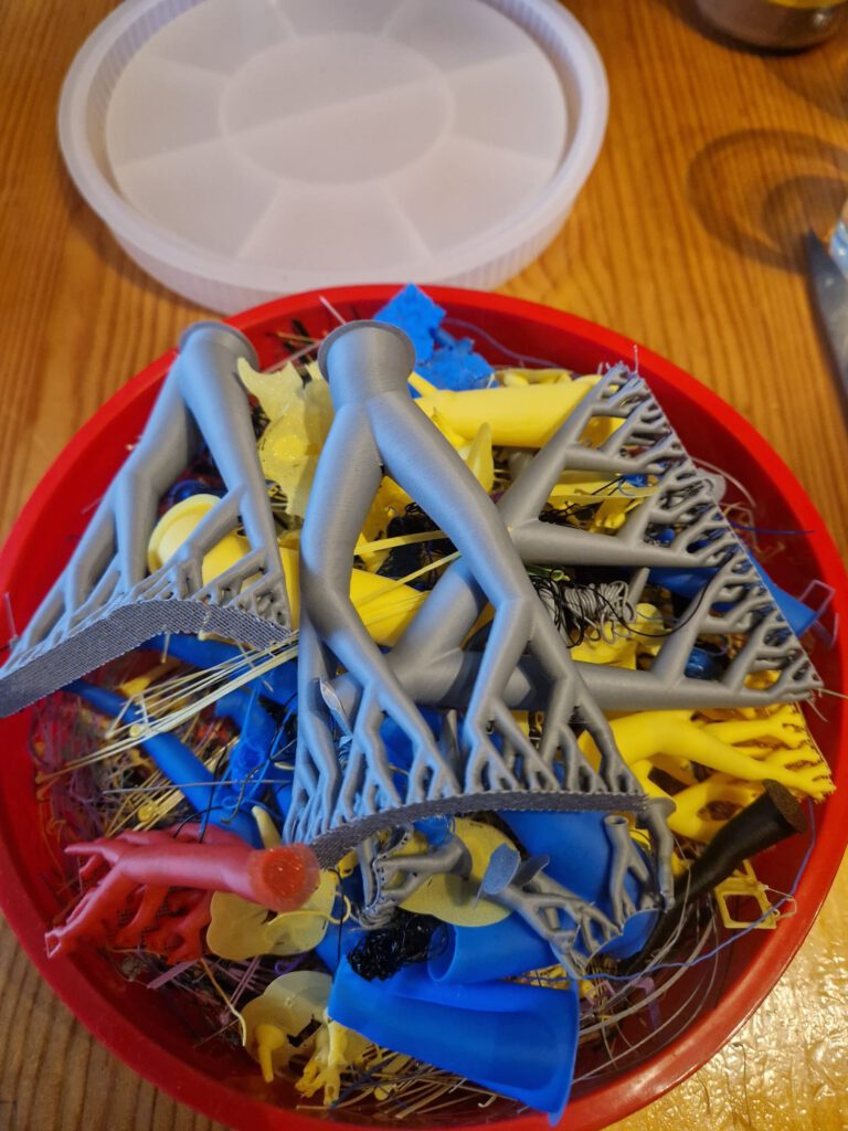 Zunächst haben wir unsere PLA-Reste gesammelt – Fehlteile, abgeschnittene Fäden, kleine Bruchstücke. Größere Teile lassen sich bei Bedarf mit einer Zange oder einem Seitenschneider weiter zerkleinern.